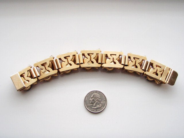It has a tongue in groove enclosure and measures 7 1/4" (18,5 cm) long and 1” (2,4 cm) wide. Circa 1960 this is high-quality vintage jewelry.